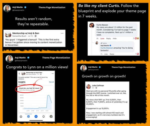 At its core, My Socials Pay is a step-by-step traffic training program by Anji Martin that teaches you how to build and scale Facebook theme pages that: